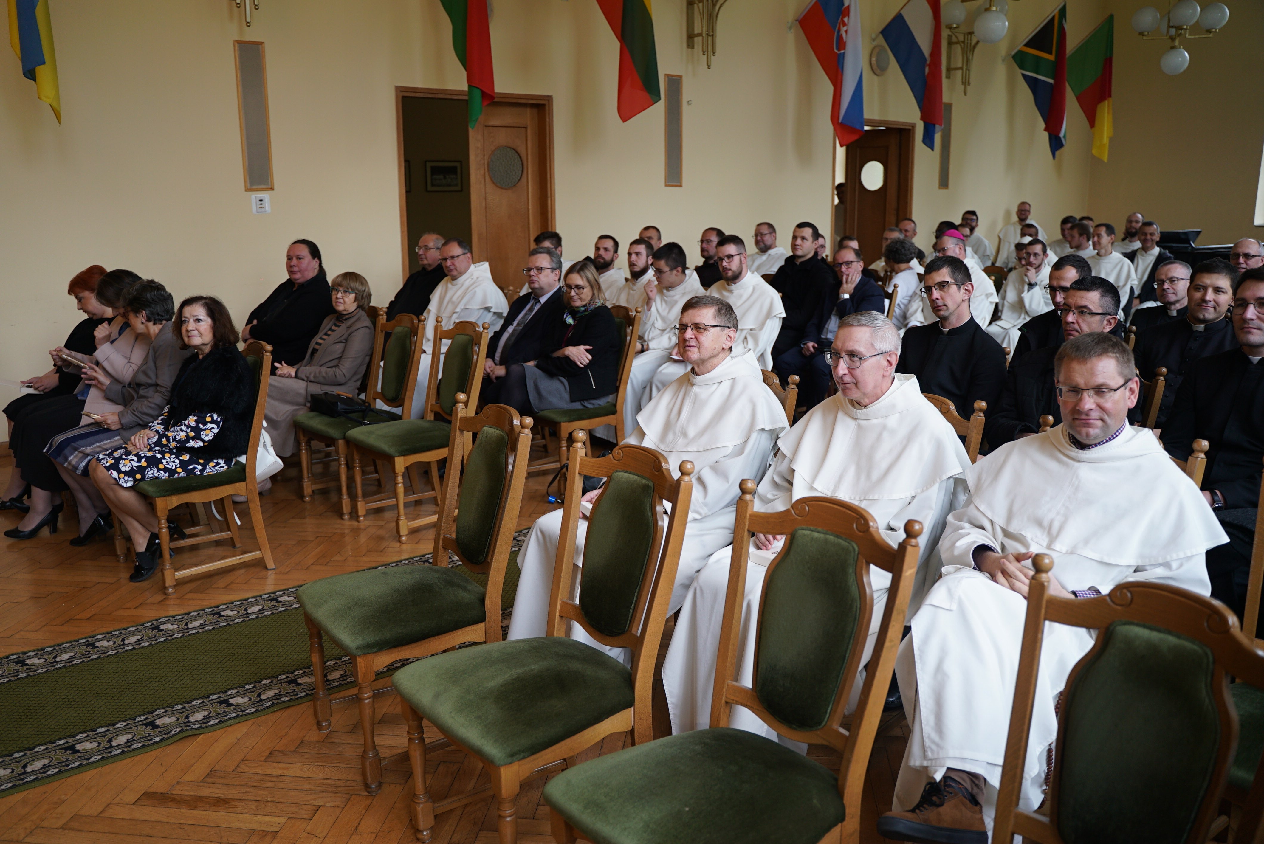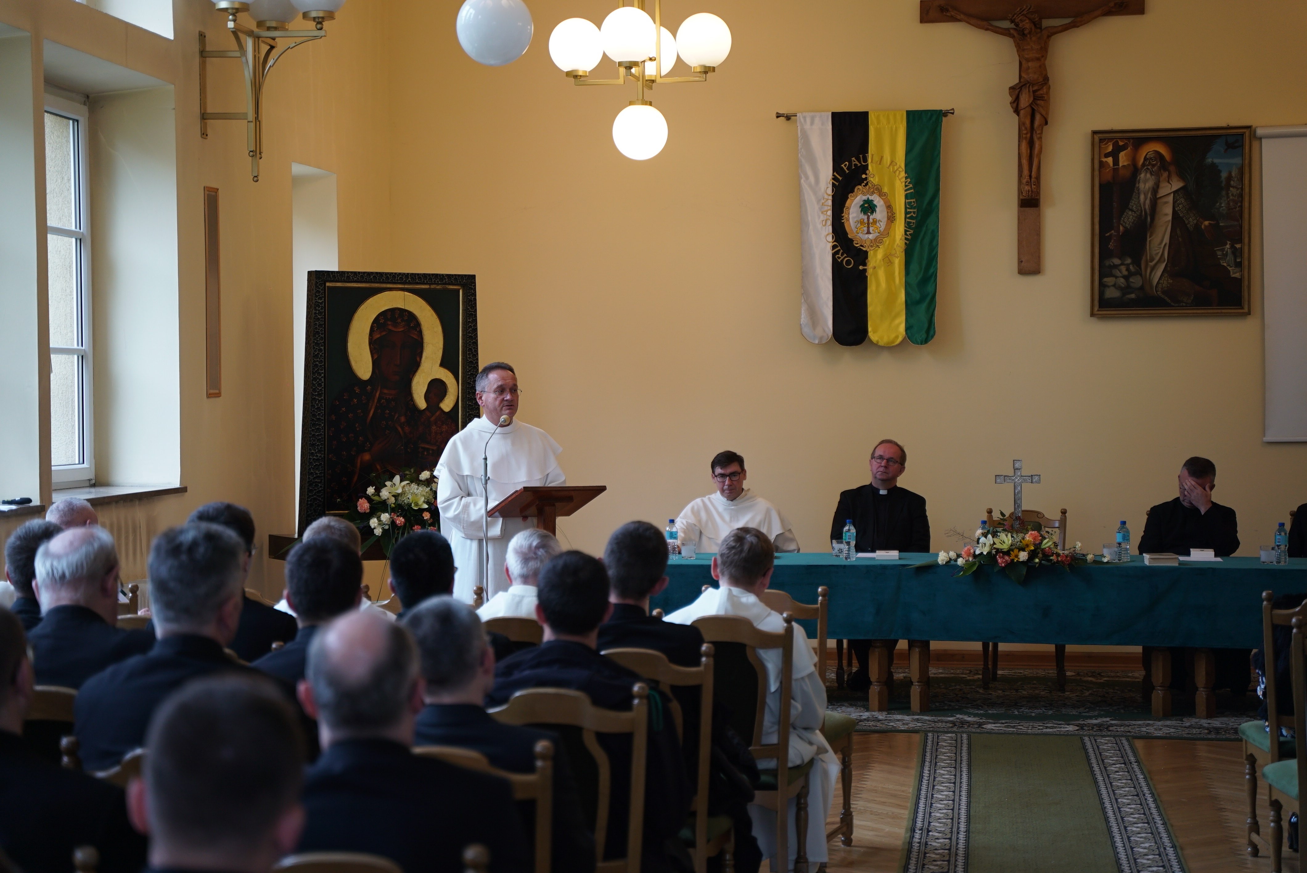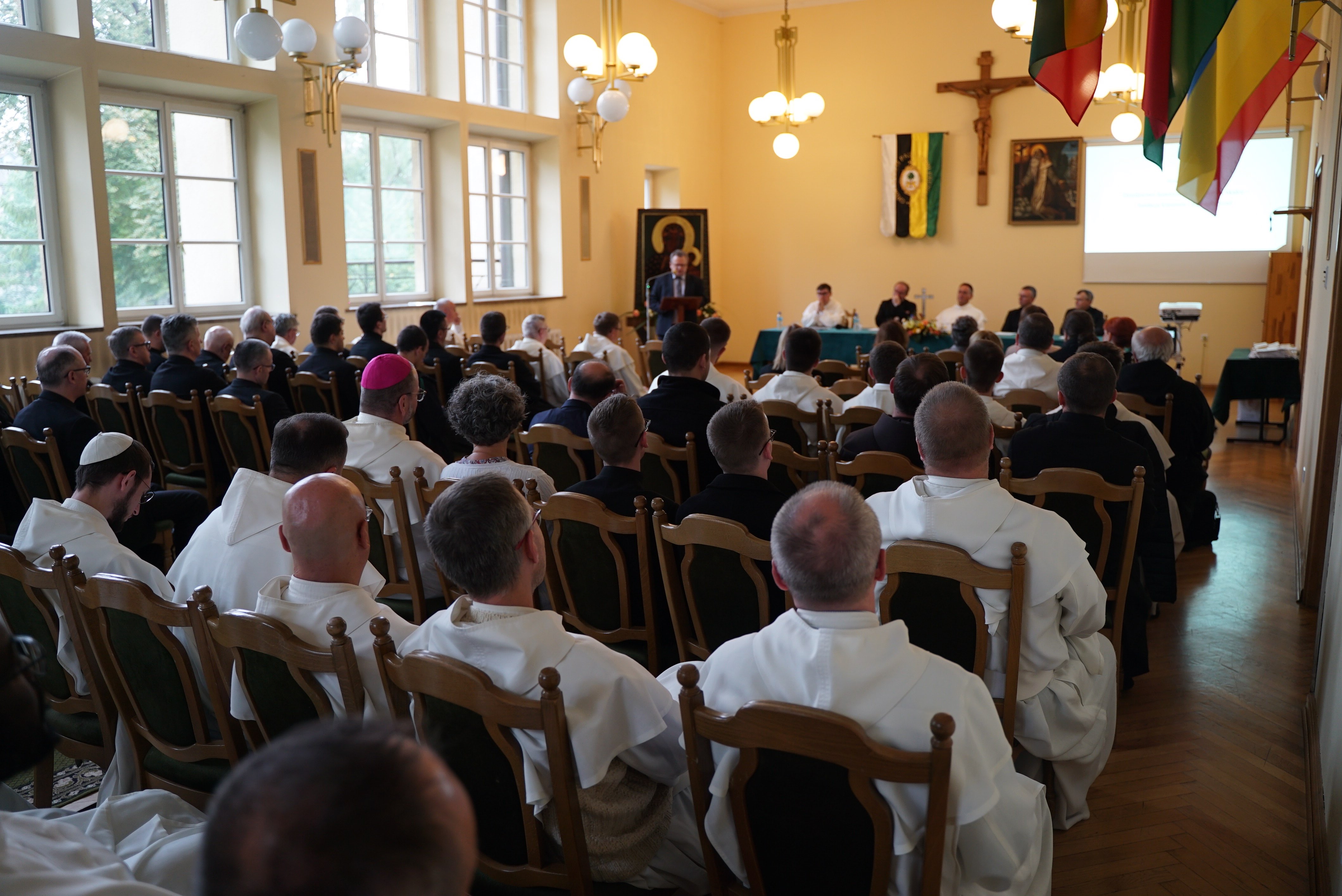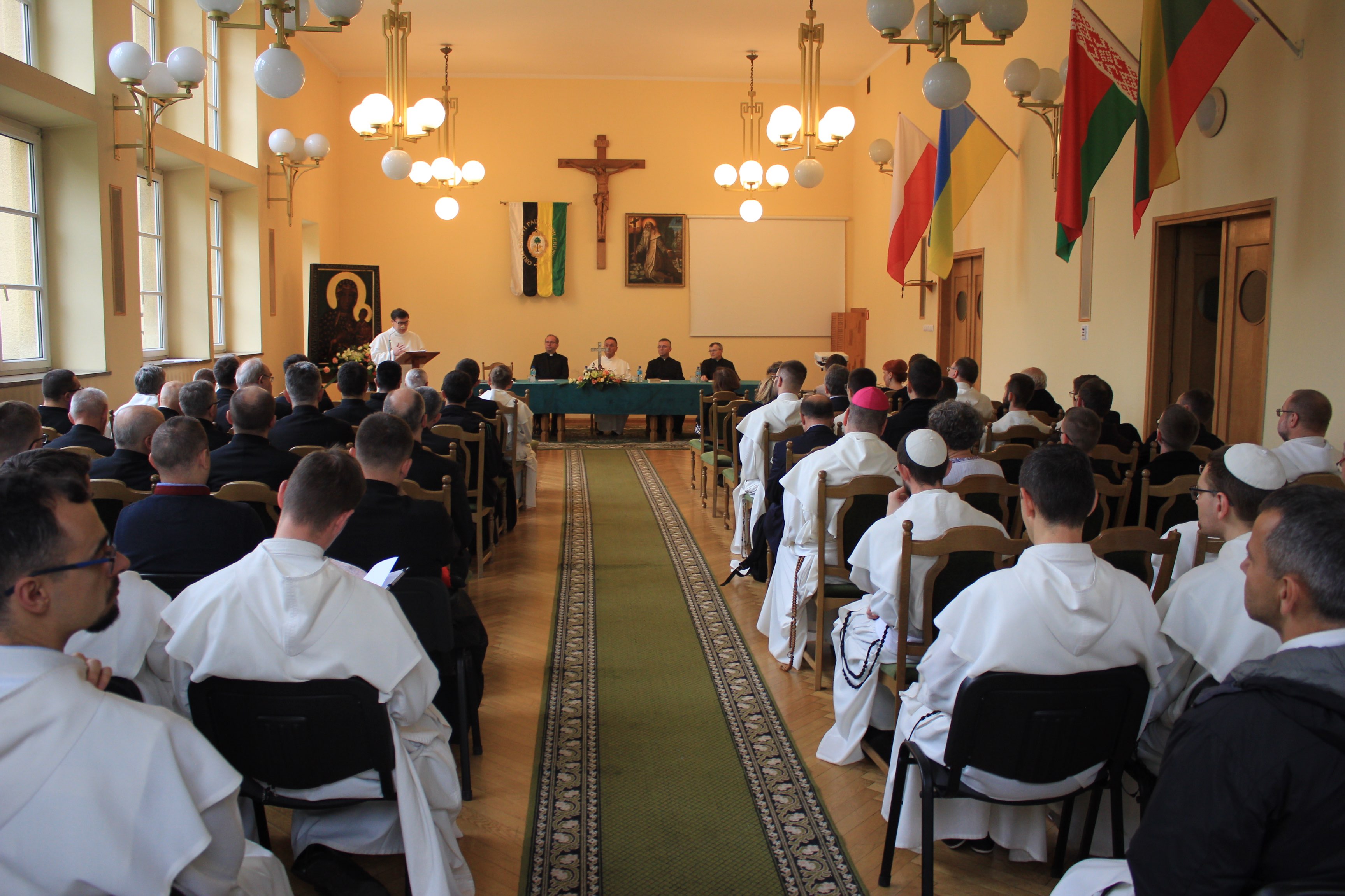 Druga część wydarzenia miała miejsce w auli Wyższego Seminarium Duchownego oo. Paulinów. Na wstępie odśpiewaliśmy hymn Gaude Mater Polonia, a następnie wysłuchaliśmy przemówienia rektora seminarium skałecznego o. Mariusza Tabulskiego OSPPE oraz wykładu inauguracyjnego zatytułowanego „Dziedzictwo historyczne Paulinów na Skałce, fundacja klasztoru i jego założyciel”, który wygłosił dr hab. Marek Kowalski (UJ).