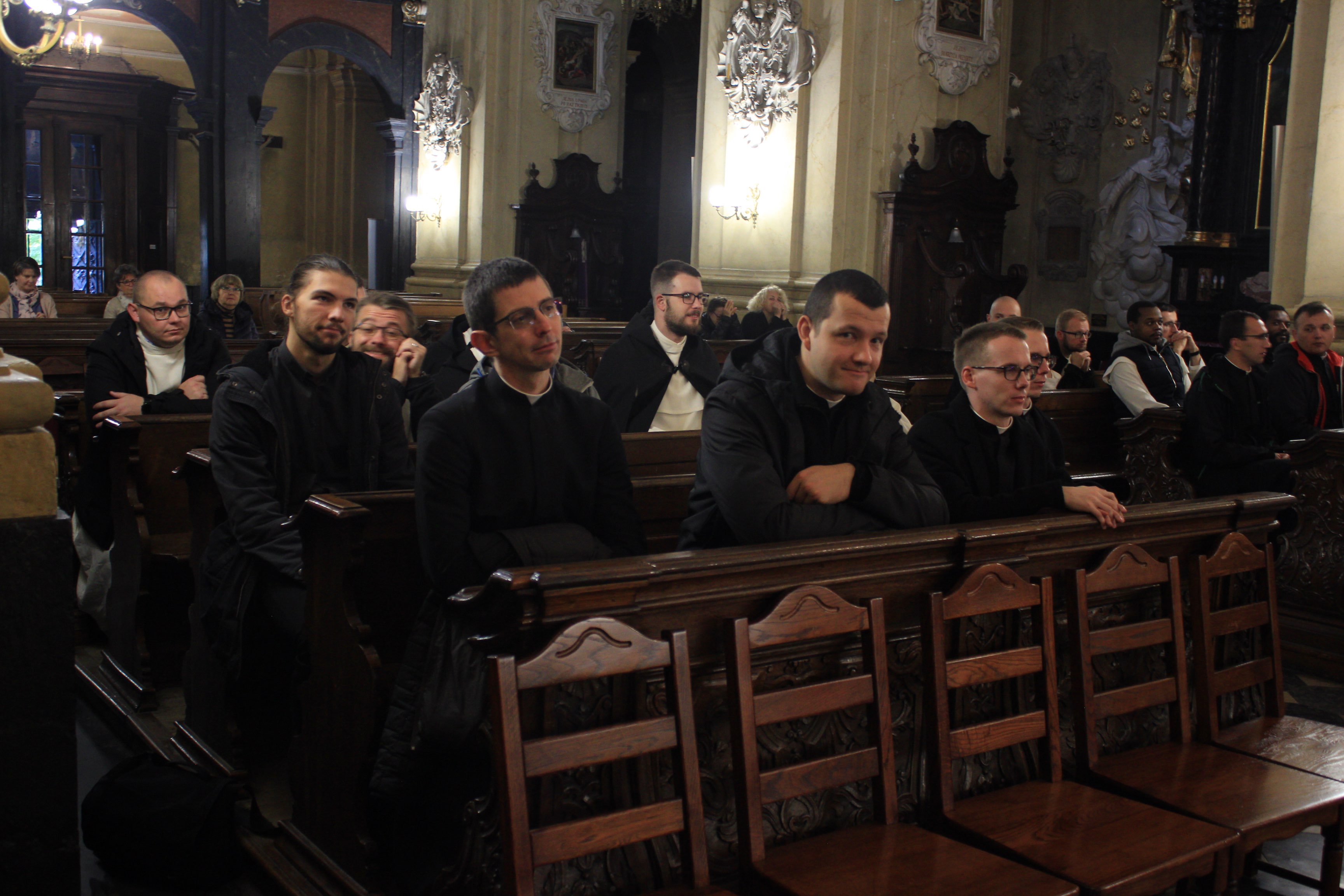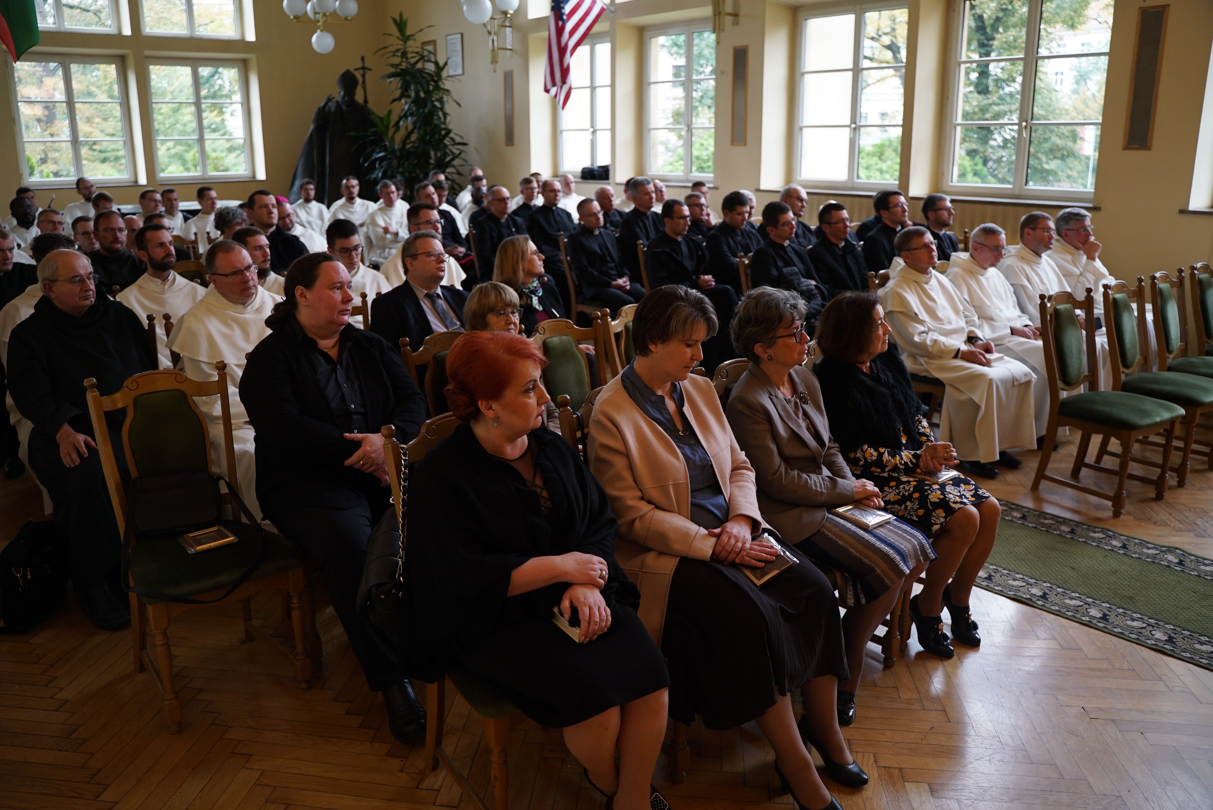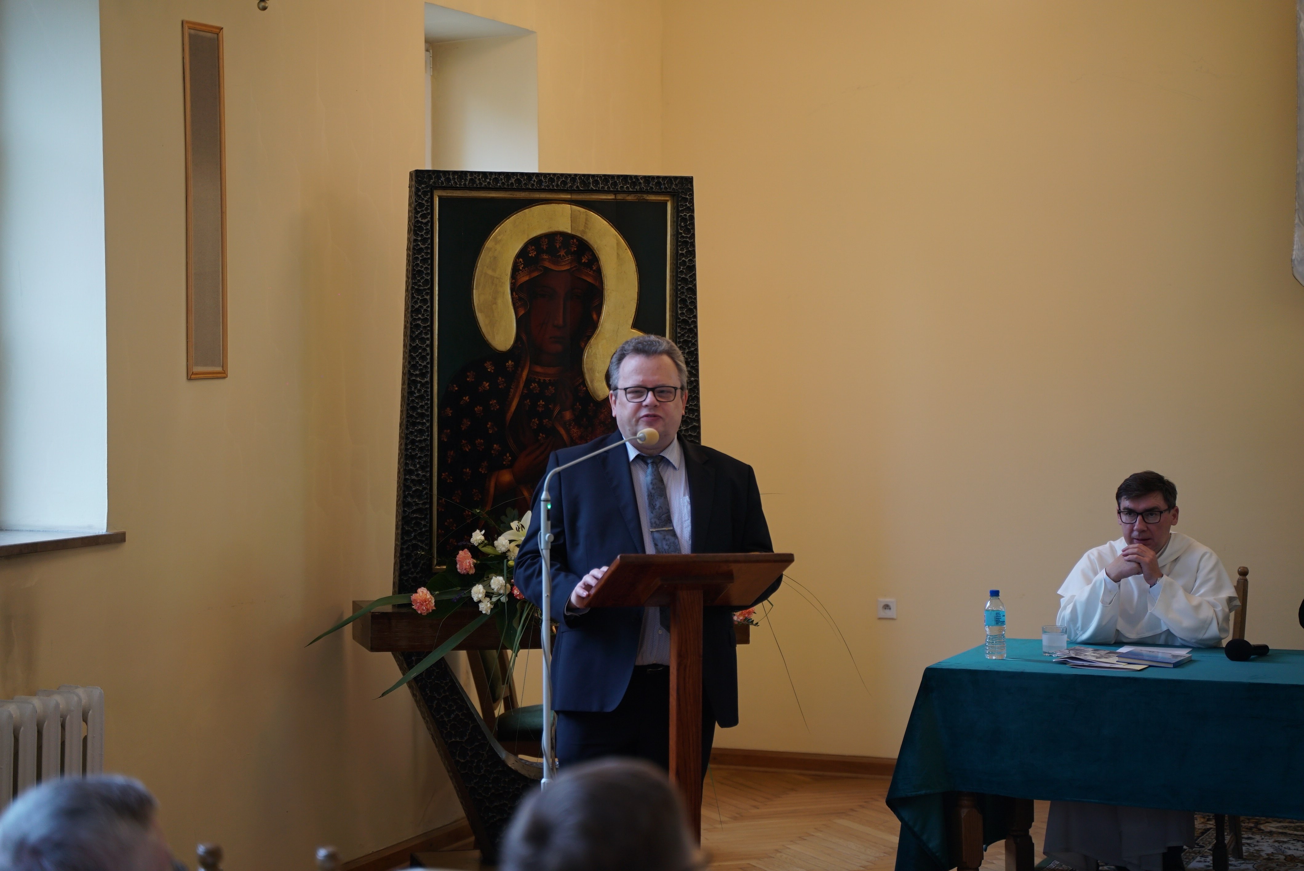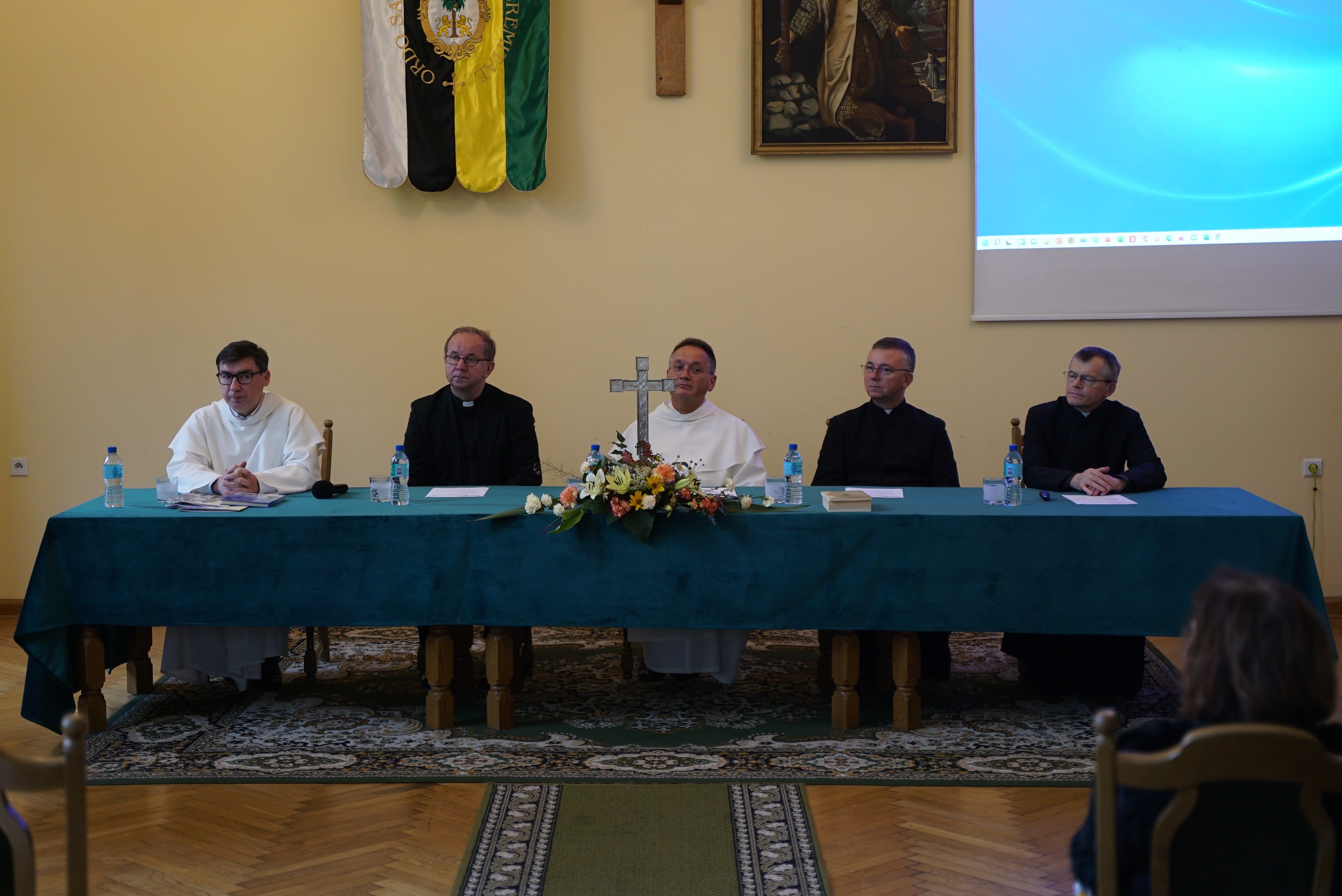 Druga część wydarzenia miała miejsce w auli Wyższego Seminarium Duchownego oo. Paulinów. Na wstępie odśpiewaliśmy hymn Gaude Mater Polonia, a następnie wysłuchaliśmy przemówienia rektora seminarium skałecznego o. Mariusza Tabulskiego OSPPE oraz wykładu inauguracyjnego zatytułowanego „Dziedzictwo historyczne Paulinów na Skałce, fundacja klasztoru i jego założyciel”, który wygłosił dr hab. Marek Kowalski (UJ).