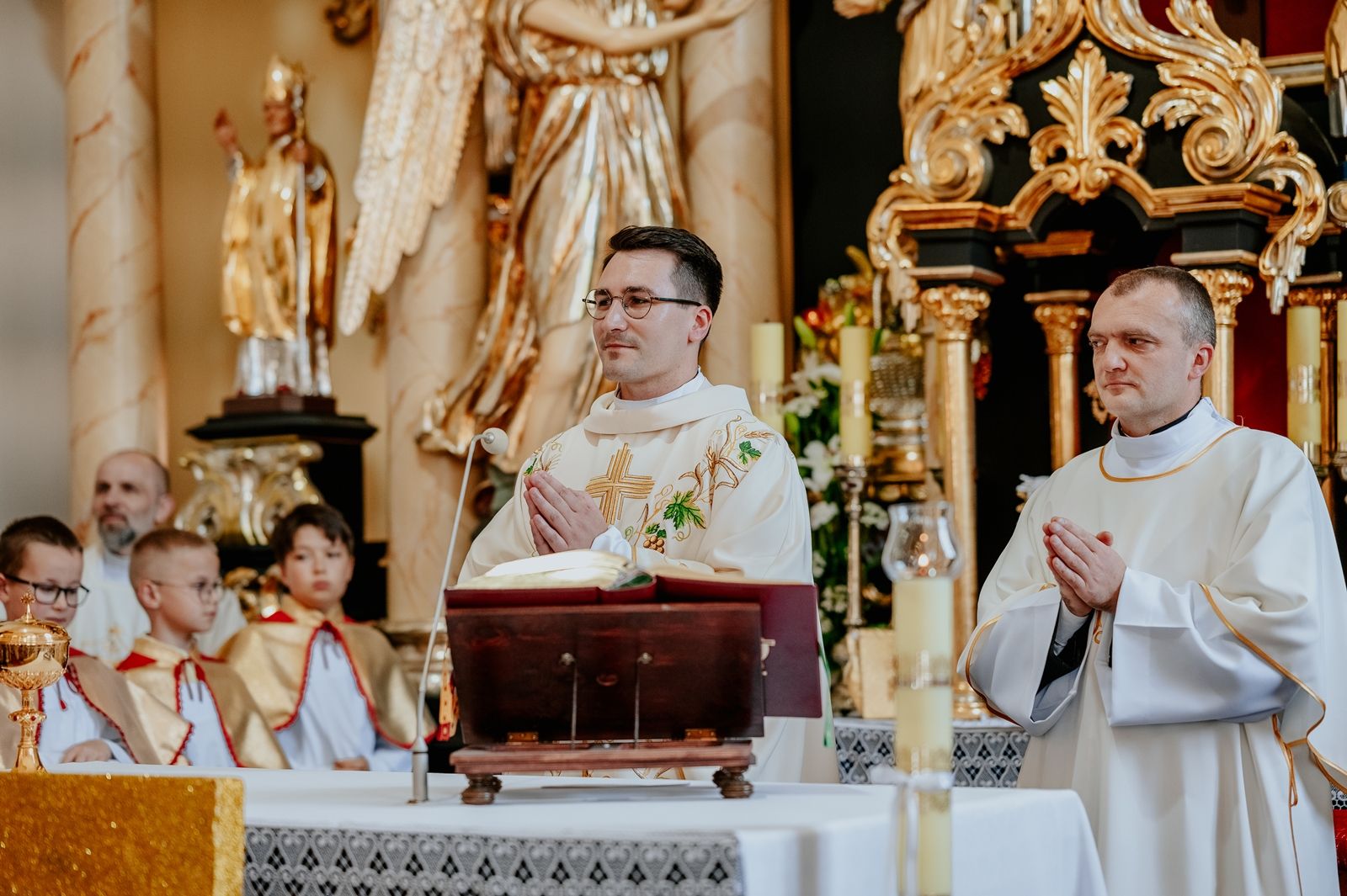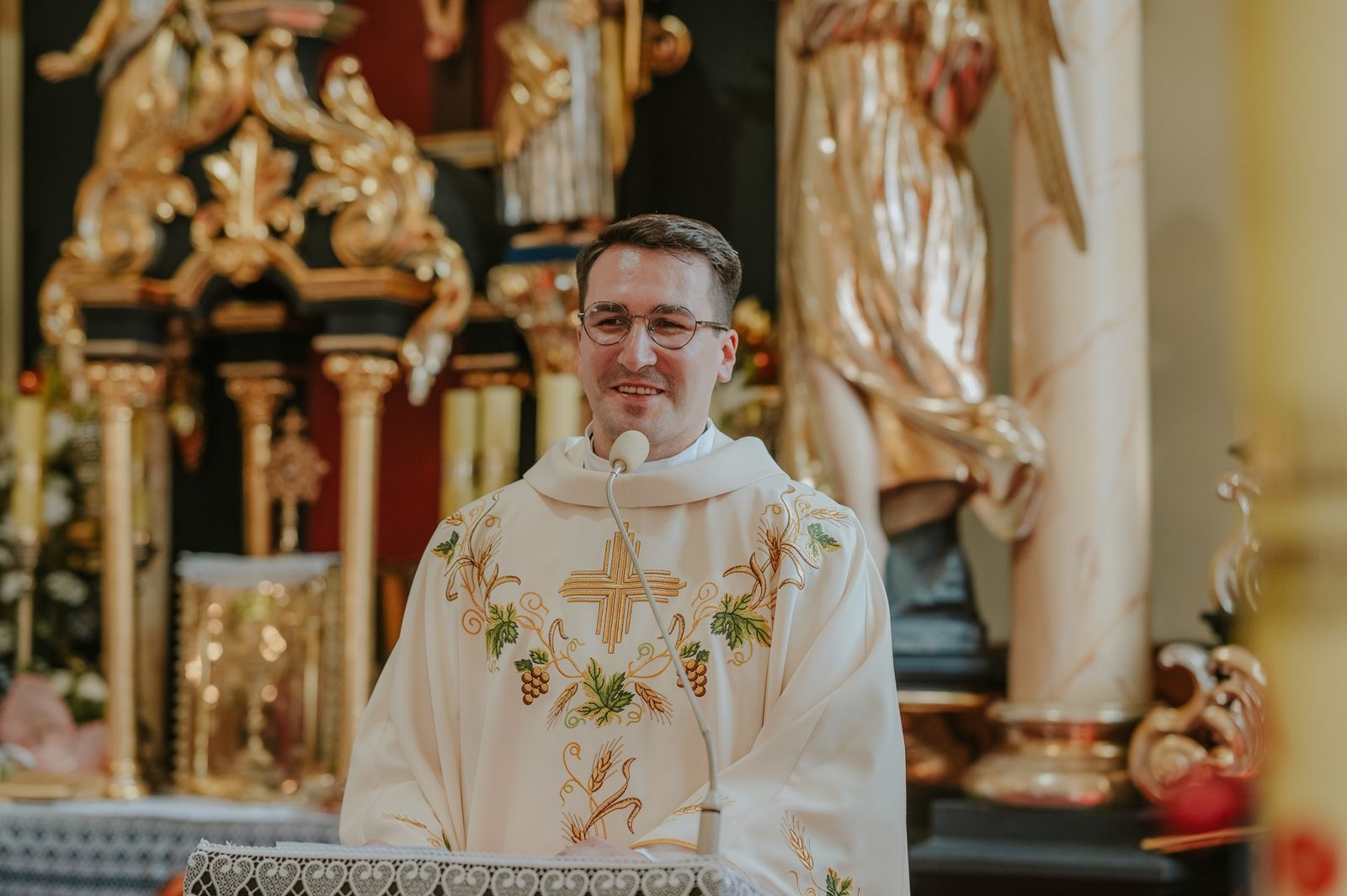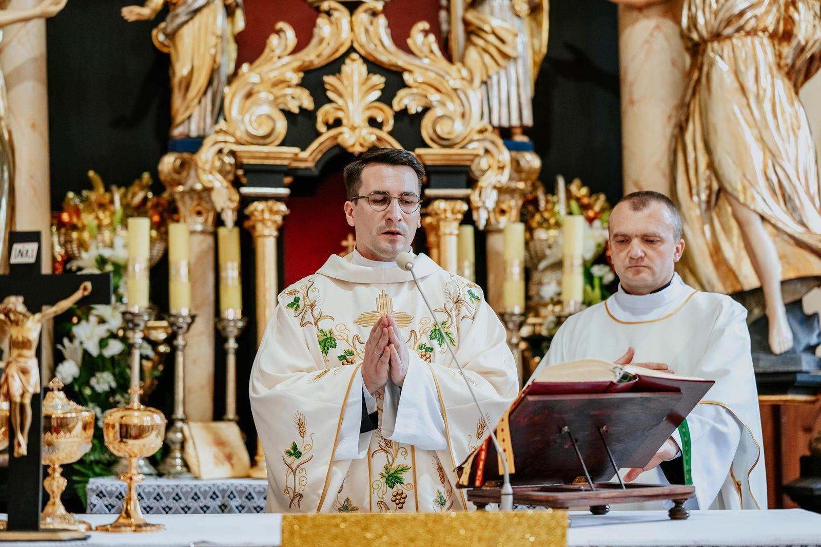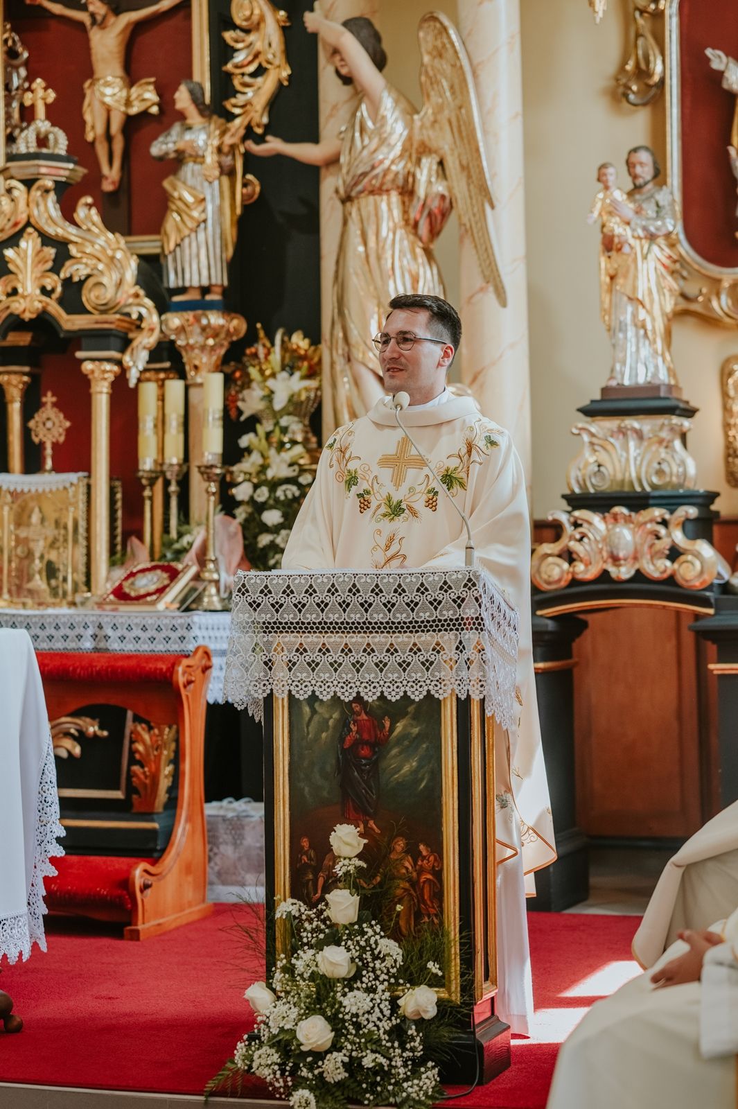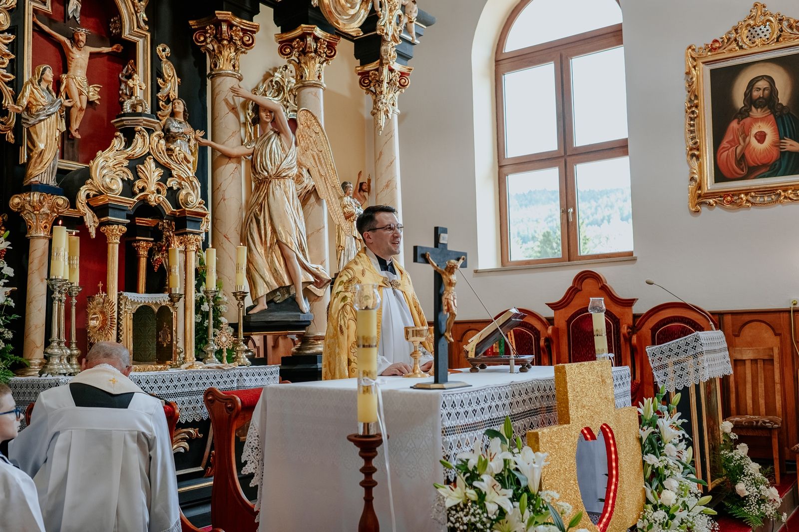 Następnego dnia, wierni zgromadzili się licznie pod domem rodzinnym prymicjanta, w którym rodzice udzielili mu swojego błogosławieństwa. Po tym, wszyscy wyruszyli w stronę kościoła, gdzie o godzinie 11:00 rozpoczęła się Eucharystia prymicyjna, której przewodniczył neoprezbiter. Licznie uczestniczyli w niej księża sercanie oraz znajomi księdzu Mateuszowi kapłani. Okolicznościową homilię wygłosił ks. Damian Płatek SCJ, wieloletni duszpasterz powołań naszej Prowincji, a dziś proboszcz parafii pw. MB Fatimskiej w Krakowie (Małym Płaszowie). Przed zakończeniem Eucharystii liczne grupy parafialne złożyły swojemu rodakowi wzruszające życzenia, zapewniając o nieustannej modlitwie w jego intencji. Po czym, głos zabrał także ks. Mateusz, wyrażając niekryte ogromem doświadczonego dobra poruszenie oraz wdzięczność za organizację tej uroczystości i obecność w jej trakcie.